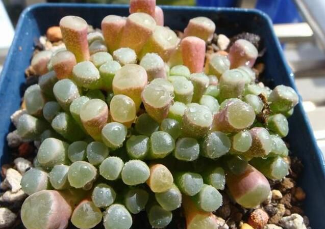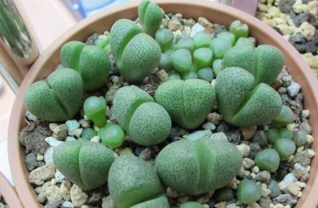 推荐理由:风铃玉叶窗特别透明,价格大约为5元一头,虽然看起来很娇嫩,但是它要比生石花等其他番杏品种生命力强的多,度夏比较容易,只要适当遮阴,每半月一次适当的“滴”一些多菌灵溶液就可以了。养得好的风铃玉叶窗特别透亮,犹如头顶一个明亮的绿灯泡一般。