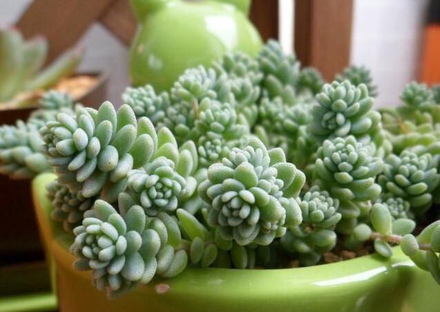 推荐理由:姬星美人价格非常便宜只要3到5元。株型非常小巧可爱,是迷你型的多肉品种。生命力强,是暴盆的理想品种,郁郁葱葱,着实可人。而且繁殖能力特别强大,枝条上会长出不定根,可以将这些不定根剪下来晾干后,进行扦插繁殖,时间更好在秋季,因为凉爽的季节是它的生长期。还要注意控水,姬星美人较为耐旱,水大了容易徒长,导致叶片松散,影响株型美观。